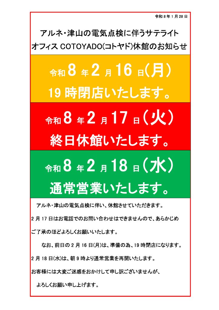 アルネ・津山の電気点検に伴い、休館させていただきます。